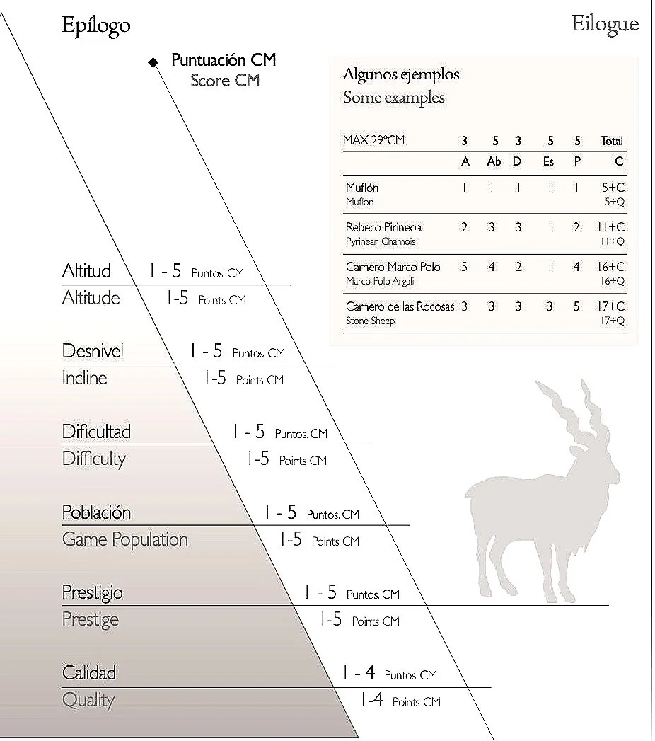 Los grados CM determinan el valor cinegético que nuestra cofradía otorga a las cacerías de montaña, en función de 6 variables: Altitud (química) Desnivel (física), Dificultad (entorno socioeconómico), Prestigio (exclusividad, lejanía, dificultad, precio), Abundancia (población), Calidad (objetiva) del trofeo. Con una puntuación máxima de 290 CM