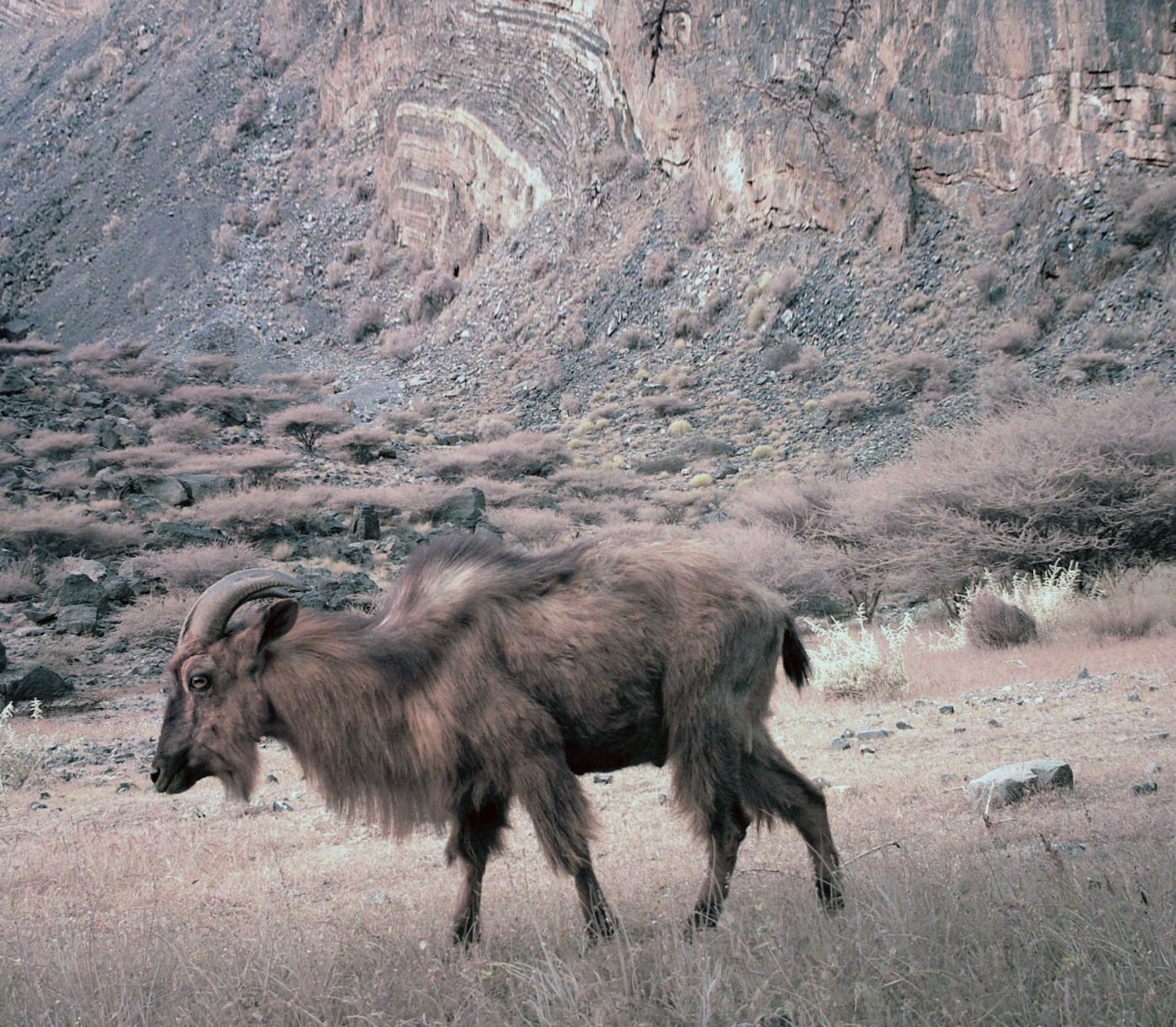 Straw colour. They do not have a beard like goats, but have a highly developed mane from the throat to the chest and upper front legs. The horns are more similar to those of the tur or barhal, than to those of the goats.